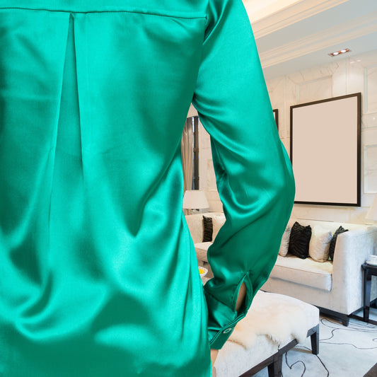 Green Satin Blouses for Women - Teal Green, Long Sleeve, Elegant & Chic Casual Style Dressy Top Blouse (S-XL)